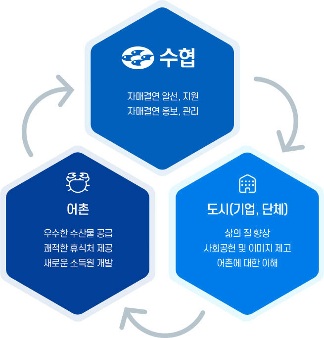 - 우리수산물 사랑 운동전개 자매결연 어촌 수산물 우선 소비하기, 어촌 특산물 판매 지원, 회사앞 직거래 장터 개설 1일 수산학교 운영(우리수산물 바로알기, 수입 수산물 구별법 등)