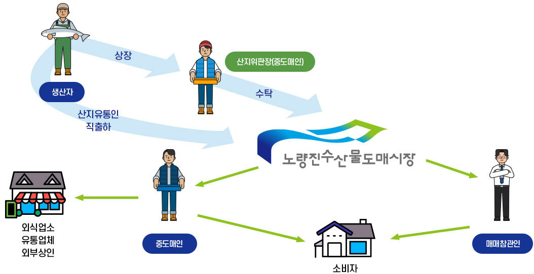 노량진수산시장은 수산물 유통업계의 혁신을 주도하고 생산자와 소비자를 함께 보호하는 법정 도매시장으로, 생산자에게는 수취가격을 높이고 소비자에게는 저렴한 가격으로 품질 좋은 먹거리를 공급하여, 수산물의 안정적인 수급과 소비자 물가안정에 기여하고 있습니다.