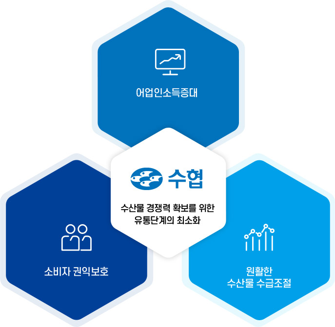 수협유통은 1992년 수협중앙회가 100% 출자하여 설립한 수산물 유통 전문 회사입니다. 수협유통에서는 “어업인에게 희망과 고객에게 믿음을”이라는 경영목표 아래 생산자에게는 유통 활로를, 소비자에게는 고품질의 수산물을 합리적인 가격에 제공한다는 목표를 실현하기 위해 최선을 다하고 있습니다.